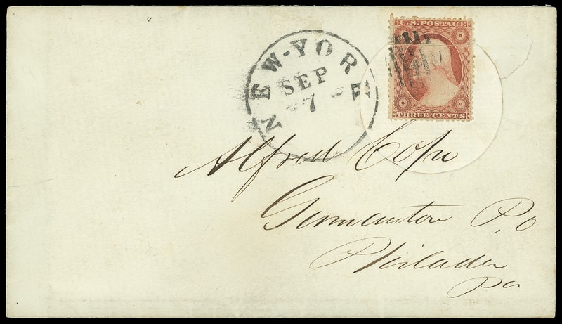 Morrison Patent Envelope, bearing 3¢ dull red (26) affixed over circular opening, tied by grid cancel duplexed with "New-York, Sep 7" cds on 1861 original letter from Lewis Leeds to his friend " I forgot to ask you yesterday to please notice whether the letter had been broken or opened as the curiosity of the clerks in the post office might have led them to examine, especially as I did not seal it on the back side which of course would not be necessary in this case…Of course if it was found to be any advantage to manufacture envelopes in this way there would be a great variety of forms of accomplishing it, Yours Truly, L W Leeds "; the stamp torn from removing letter, Very Fine, ex-Piller ; with 1993 P.F. certificate.