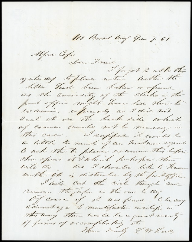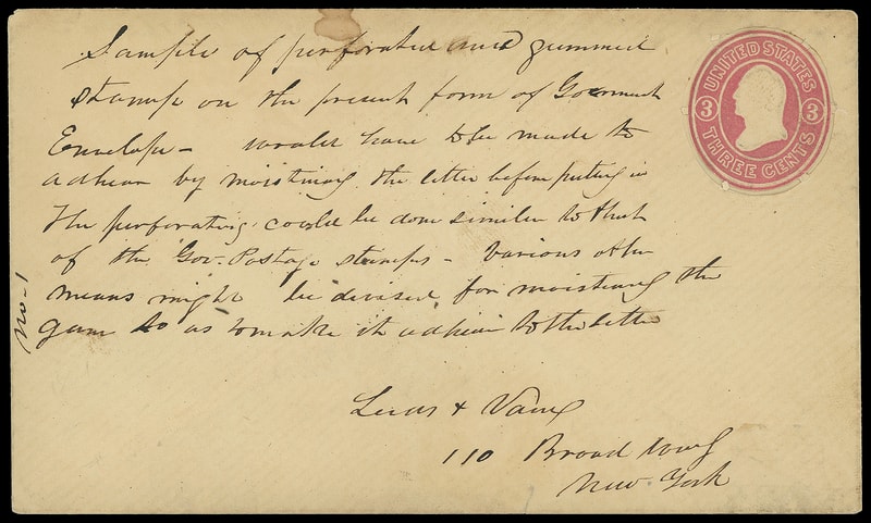 1861, 3¢ Leeds & Vaux Patent Envelope Essay, UPSS #71, size 7, gummed flaps, issued envelope with cut around indicium and glue on back of indicium to adhere to contents, manuscript " No. 1, Sample of perforated and gummed stamp on the present form of Government Envelope- have before made its adhesion by moistening the letter before putting in. The perforating could be done similar as that of the Gov. Postage. Stamps-various other means might be devised for moistening the gum so as to make the adhesion to the letter, Leeds & Vaux, 110 Broad Street, New York ", Fine and unique self-canceling envelope essay.
