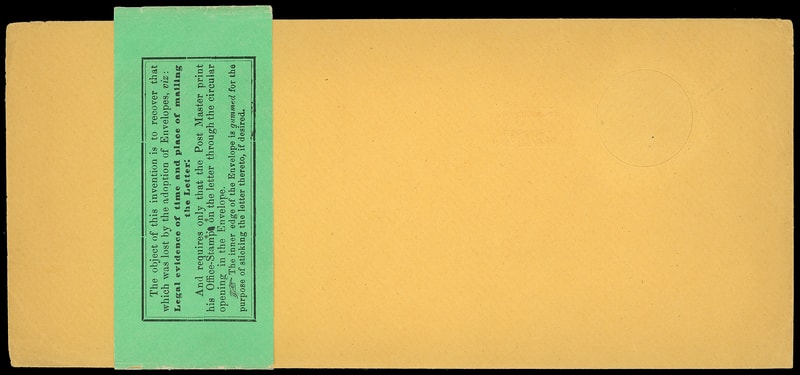 Morrison Patent Envelope, group of 5 envelopes comprising four unused Morrison Patent envelopes, first with gum around circular opening to affix letter and to left "Post Mark Patent June 19, 1860" in embossed rectangle with pointing hand towards opening, second same legal-size version with additional green advertising label reading "The object of this invention is to recover that which was lost by the adoption of Envelope…Legal evidence of time and place of mailing the Letter.", third without glue and fourth same with addressing to Lewis W Leeds, Flushing N.Y., and last item is a 1904 application of this envelope in envelope, Very Fine and unique Mirrison group.