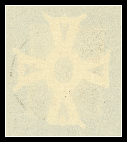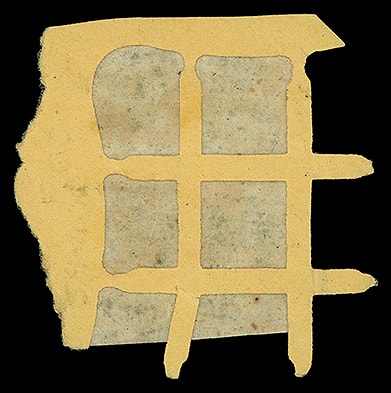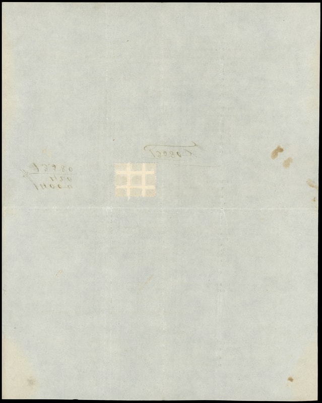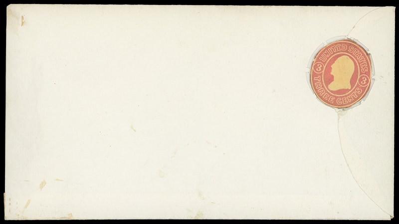 Self-canceling envelope essay; indicium would tear from envelope and partially stick to both envelope and contents. Indicia cut from envelope and privately pasted onto assembled envelope by Leeds and Vaux.Lot 1009