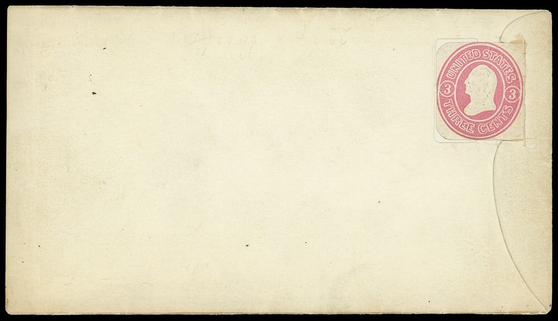1861, 3¢ Leeds & Vaux Patent Envelope Essay, stationery rectangular die cut, gummed for closing and affixed to side opening patent envelope, Very Fine and apparently unique.