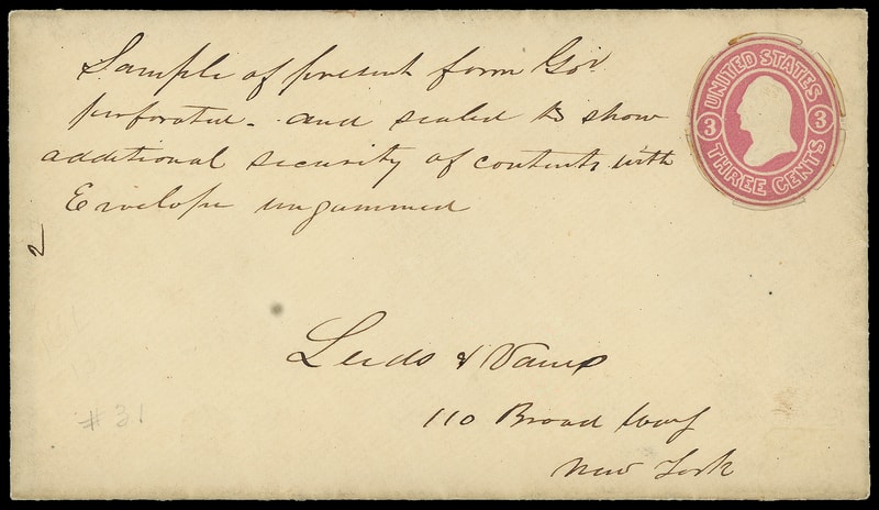 1861, 3¢ Leeds & Vaux Patent Envelope Essay, UPSS #70, size 5, with flap glue removed, issued envelope with cut around indicium and glue on back of indicium to adhere to contents by Leeds and Vaux, manuscript " 2, Sample of present form Go's perforated and scaled to show additional security of contents with Envelope ungummed/ Leeds and Vaux/ 110 Broad Street, New York ", Very Fine and unique self-canceling envelope essay.