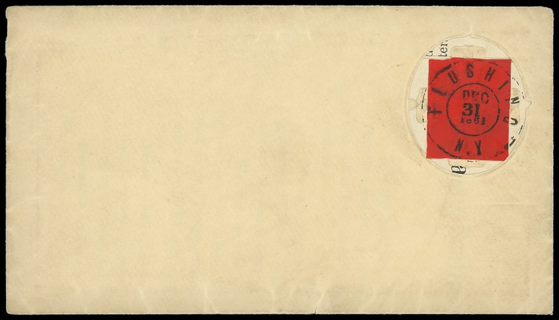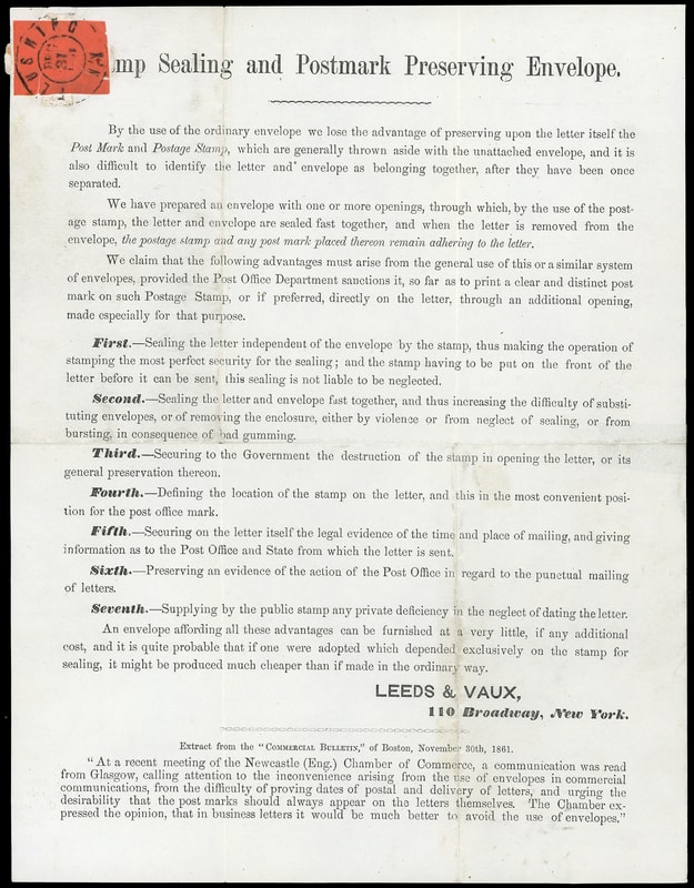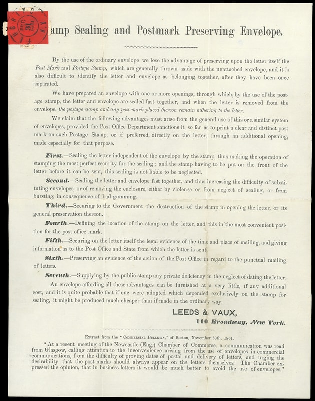 Leeds & Vaux Patent Envelope, Type 3 envelope with Maltese Cross pattern lattice embossed "Leeds & Vaux, 110 Broadway" at center, red stamp size label tied by "Flushing N.Y., Dec 31, 1861" cds on printed Leeds & Vaux circular advertising "Stamp Sealing and Postmark Preserving Envelope", unaddressed, Very Fine.
