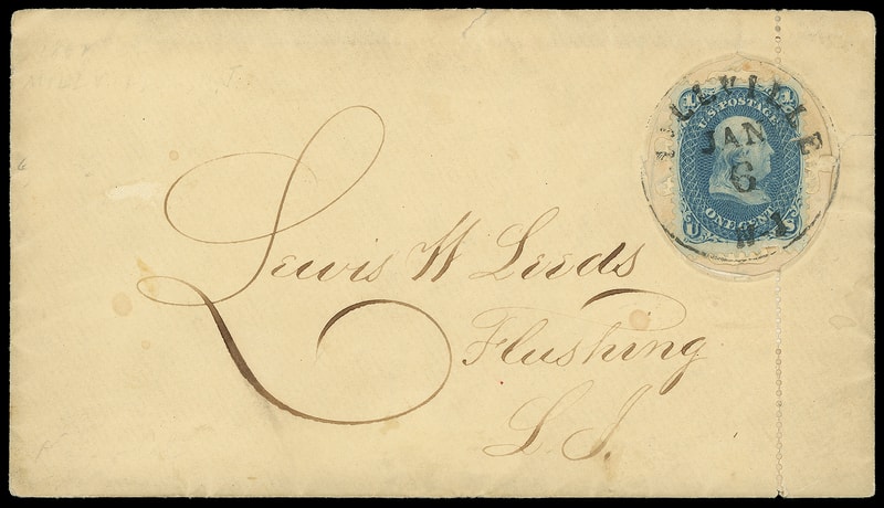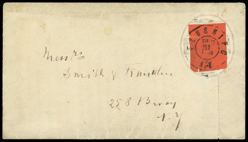Leeds & Vaux Patent Envelope, Type 3 envelope with Maltese Cross pattern lattice embossed "Leeds & Vaux, 110 Broadway" at center and vertical perforations at right, orange stamp size label tied by "Flushing N.Y., Dec 31, 1861" cds on printed Leeds & Vaux circular advertising "Stamp Sealing and Postmark Preserving Envelope", addressed to Messrs Smith & Franklin, New York City; some envelope tape reinforcing, light soiling, F.-V.F. and unique label use.