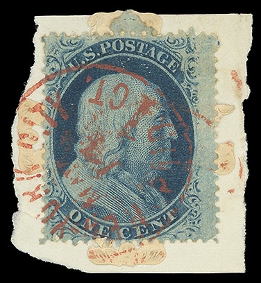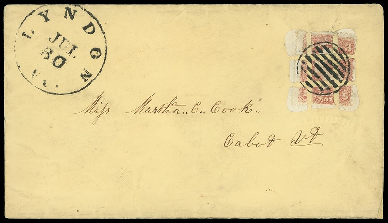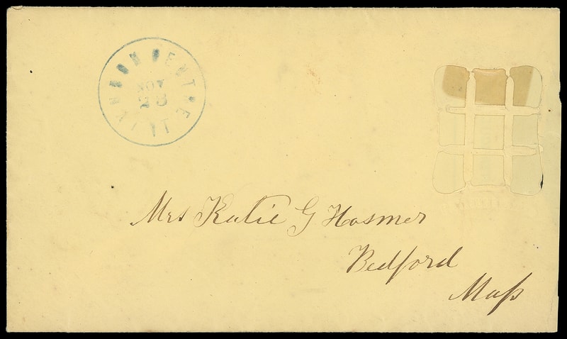 This envelope illustrates Leed's purpose for his envelope design, to damage the stamp, rather than Morrison's original intention of providing secure proof of the date of a legal agreement with a post office datestamp striking the enclosed letter. The Leeds brothers purchased the Morrison patent in early 1862 for $1,000 (about $32,000 in 2025 dollars) and changed the design to add reuse prevention.Lot 1012