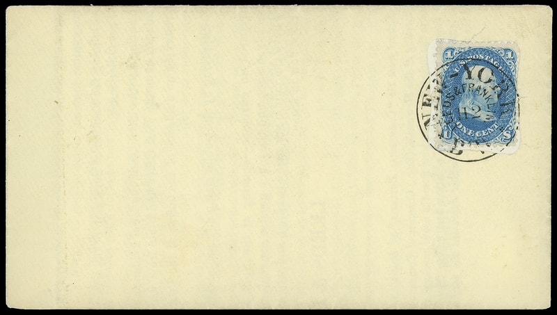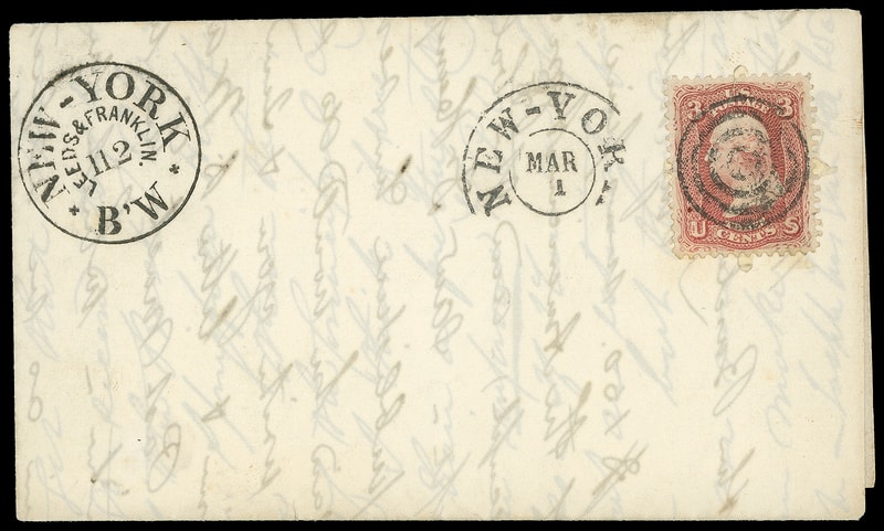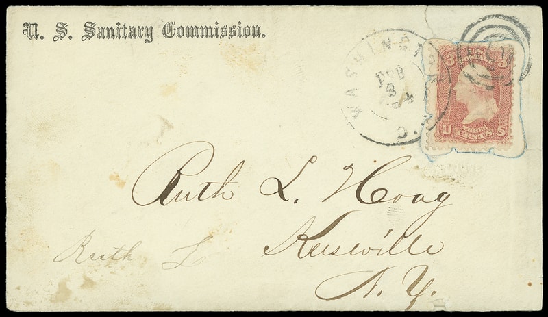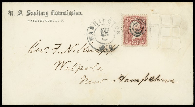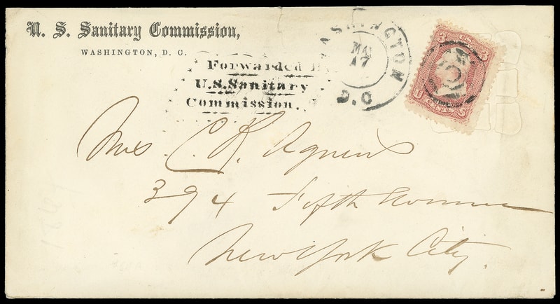 Leeds & Franklin Patent Envelope, "U.S. Sanitary Commission, Washington D.C." imprint envelope with Type IA with "#" bars lattice pattern, bearing 3¢ rose (65) diagonally affixed over lattice, canceled by four-rings cancel duplexed with "Washington D.C. May 17" duplex addressed to New York City, neat " Forwarded by U.S. Sanitary Commission " three-line stencil handstamp; couple small top edge tears, no flap, Very Fine; with 2009 P.F. certificate.