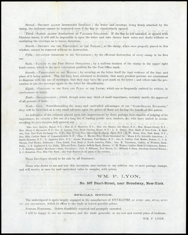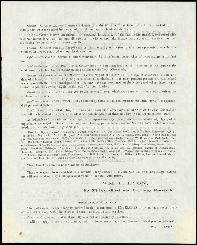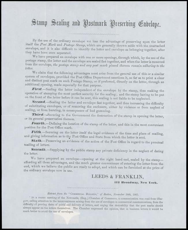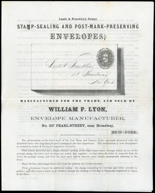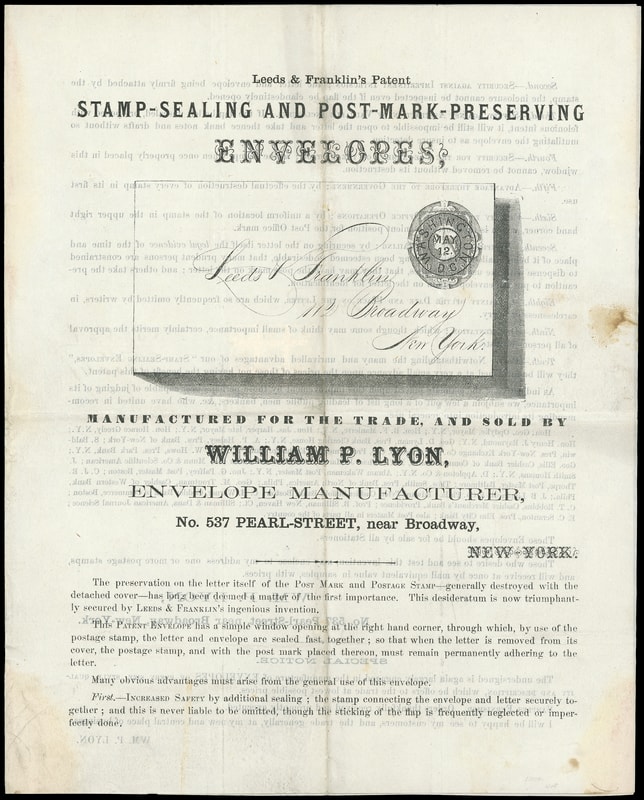 The illustrated circular shows an example of the Leeds & Franklin's Patent envelopes and a list of ten reasons for using them including security against impertinent intrusion. A key item to the collector of patent envelopes.Lot 1015