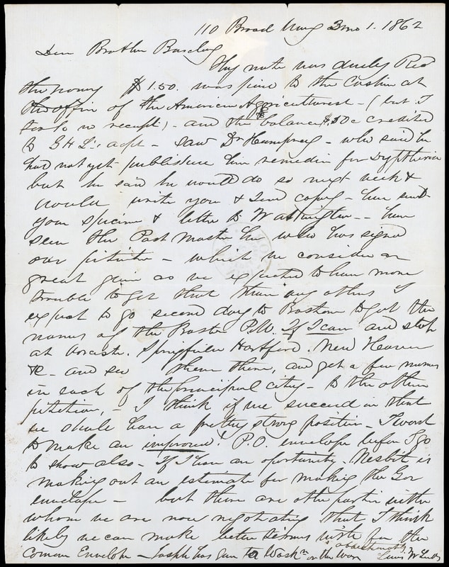 Leeds & Franklin with Morrison Patents Combination Envelope, unused amber Type 2 four-point lattice in rectangular opening envelope insert only, bearing 3¢ rose (65) , canceled by four-rings duplexed with "New-York, Mar 1" cds on folded letter datelined "110 Broad Way 3 mo 1. 1862" from Lewis W. Leeds to his brother Barclay concerning business and promotion of the patent envelopes, " …a pretty strong position - toward to make an improved! P.O. envelope before I go to show also - If I have an opportunity Nesbitt is making out an estimate for making the envelope - but there are other parties with whom we are now negotiating that I think likely we can make better… "; stamp torn from opening as Leeds originally intended the lattice to do, Very Fine.