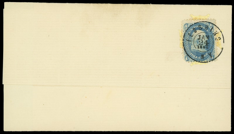 Leeds & Franklin Patent Envelope, yellow Type 3 variety Maltese Cross pattern lattice that was attached to envelope with two prongs on each side instead of one central prong, tied on blank lettersheet by "Flushing N.Y. Jan 24, 1862" cds, fresh and Very Fine.