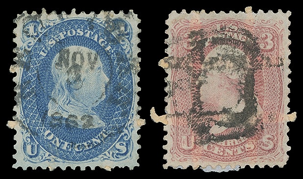 Leeds & Franklin Patent Envelope, buff Type IA with "#" bars lattice pattern on reverse of 1¢ blue (63) canceled by "New-York, Nov 3, 1862" cds and 3¢ rose (65) canceled by cork; 1¢ small tear, Very Fine pair showing the Type Ia lattice clearly; 1¢ with 2003 P.F. certificate.
