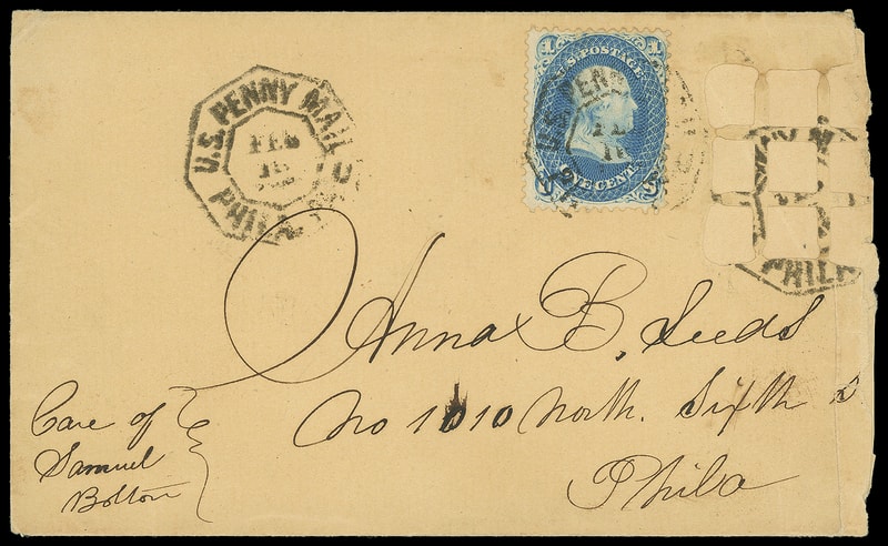 Leeds & Franklin Patent Envelope, buff Type IA with "#"bars lattice pattern, bearing 1¢ blue (63) tied by "U.S. Penny Mail, U Phila. Pa. Feb 15" octagonal carrier datestamp to Anna B. Leeds at a local Philadelphia street address; opened and roughly reduced at right slightly into window, Only Two Recorded Leeds Philadelphia Carrier Uses , Fine and rare Leeds use.