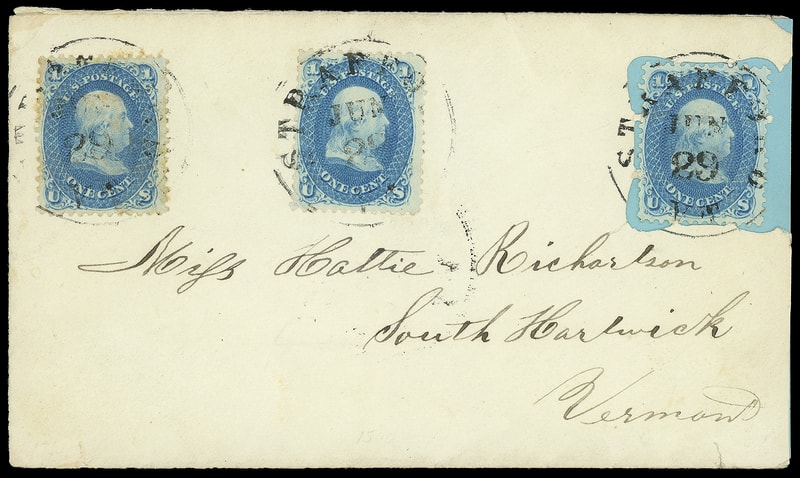 Leeds & Franklin Patent Envelope, Type IA with "#" bars lattice pattern, bearing three 1¢ blue (63) singles, affixed along top of envelope, right stamp properly affixed over latticework, each tied by "Stratford Vt. Jun 29" cds addressed to South Harwick Vt., the stamp affixed over latticework lifted and placed on blue card (latticework still adheres to back of stamp); slightly reduced at right, Very Fine, ex-Christian, Bailar .