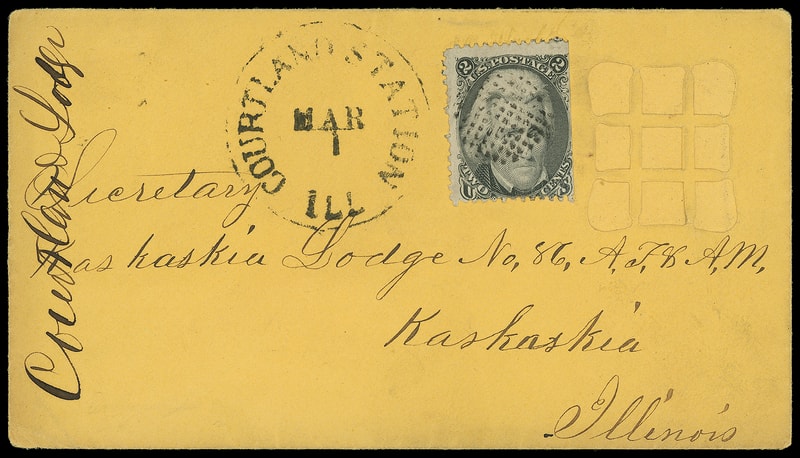 Leeds & Franklin Patent Envelope, unsealed orange buff envelope with Type IA with "#" bars lattice pattern, bearing 2¢ black (73) nat. s.e., perf flaws at left, canceled by grid of dots, matching "Courtland Station, Ill. Mar 1" cds addressed to Kaskasia Ill., stamp affixed to left of latticework which is intact, Fine and rare circular rate Leeds envelope use, only two 2¢ Black Jack use .