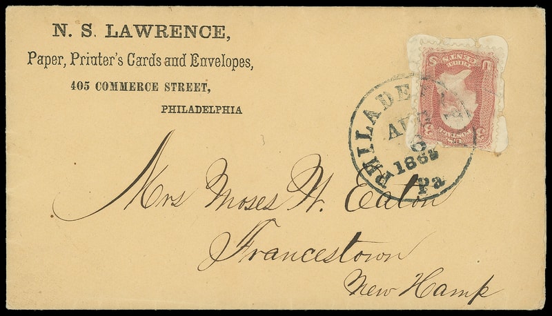 Leeds & Franklin Patent Envelope, buff "N.S. Lawrence, Paper, Printer's Card and Envelopes" corner card envelope with Type IA with "#" bars lattice pattern, bearing 3¢ rose (65) correctly affixed over lattice, tied by "Philadelphia, Pa. Aug 6, 1863" cds addressed to Francestown, N.H., with original 1863 letter, Very Fine and choice.