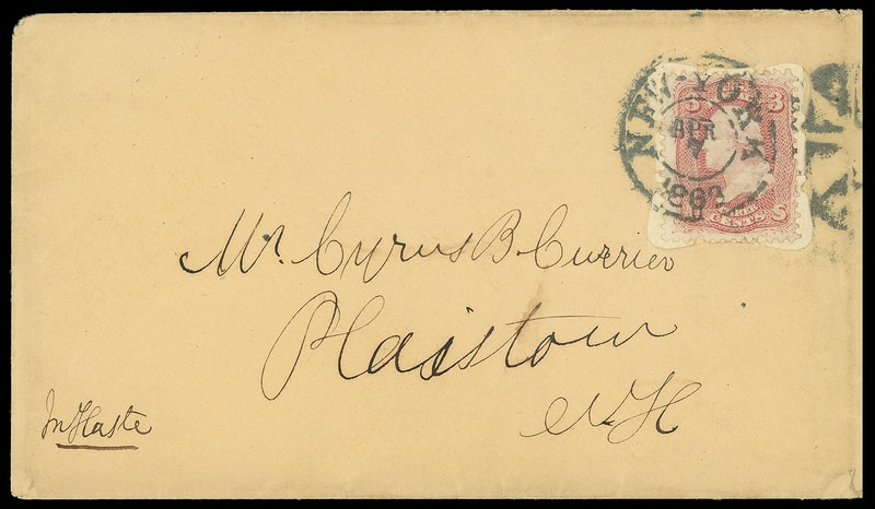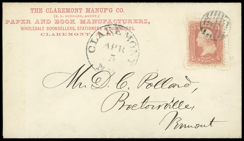 This use is Claremont N.H. where two earlier uses are known with "The Claremont Manuf'g Co., Paper and Book Manufacturers" corner cards. One is in this collection, the other bearing a 2¢ Black Jack was in the Gross collection.Lot 1034