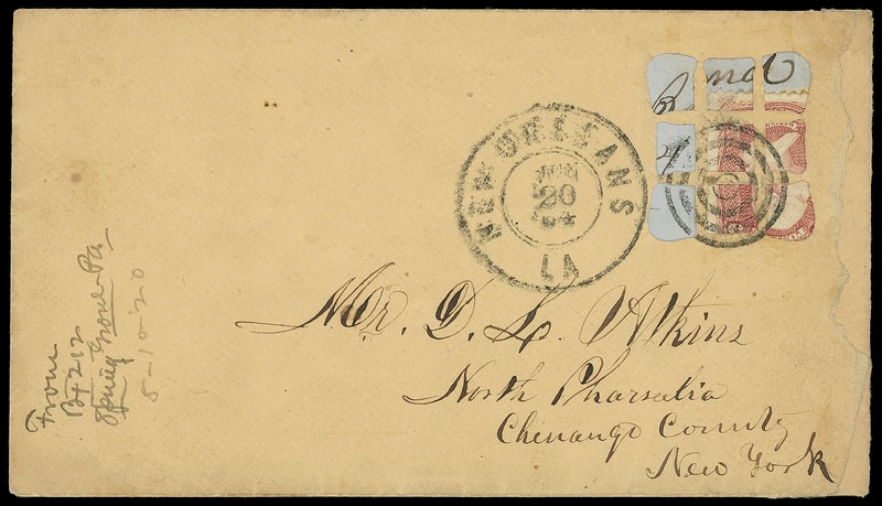 Leeds & Franklin Patent Envelope, buff envelope with Type IA with "#" bars lattice pattern, bearing 3¢ rose (65) incorrectly affixed under lattice, tied by four-ring target duplexed with "New Orleans La. Jun 20 '64" duplex addressed to North Pharsalia N.Y.; opened irregularly at right and repaired, non-contemporary docketing at left, Very Fine appearance, ex-Skinner ; with 2009 P.F. certificate.