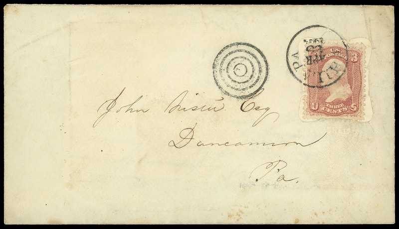 Leeds & Franklin Patent Envelope, amber envelope with Type IA with "#" bars lattice pattern, bearing 3¢ rose (65) correctly affixed over lattice, tied by "Phila. Pa. Apr 25, 1864" cds addressed to Duncannon Pa., original 1864 enclosed letter; light wear, F.-V.F.