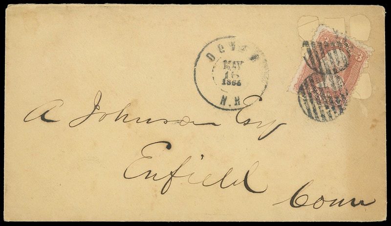Leeds & Franklin Patent Envelope, buff envelope with Type IA with "#" bars lattice pattern, bearing 3¢ rose (65) affixed diagonally over lattice, tied by two stikes of circular grid cancel, matching "Dover N.H. May 16, 1865" cds addressed to Enfield Conn.; minor toning at right, Fine.