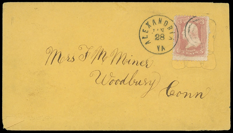 Leeds & Franklin Patent Envelope, orange envelope with Type IA with "#" bars lattice pattern, bearing 3¢ rose (65) affixed over lattice, tied by "Alexandria Va. Jan 28" cds duplex addressed to Woodbury Conn.; lower left corner paper loss.