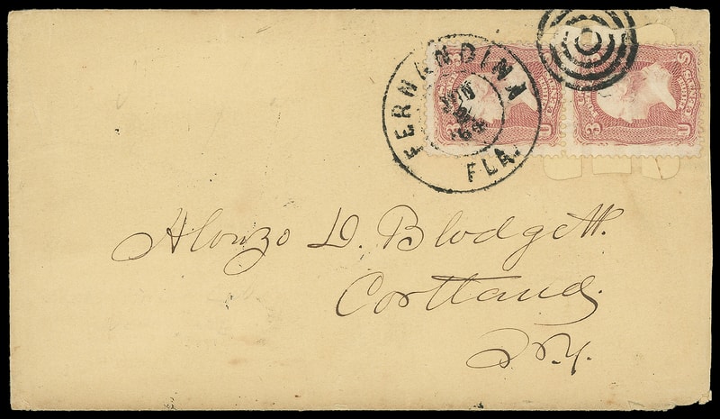 Leeds & Franklin Patent Envelope, buff envelope with Type IA with "#" bars lattice pattern, bearing 3¢ rose (65) vertical pair affixed over lattice, tied by bold "Fernandina Fla. Jun 2 '64" cds duplex addressed to Cortland N.Y.; bottom stamp torn as Leeds patent intended, reduced slightly at right, Very Fine and rare Leeds use from Florida.