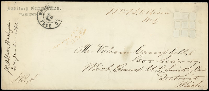 Leeds & Franklin Patent Envelope, "U.S. Sanitary Commission, Washington D.C." imprint legal-size envelope with Type IA with "#" bars lattice pattern, "Washington D.c., Free, Jan 23 '64" cds and "Wm. B. Allison" free frank addressed to the Sanitary Commission in Detroit, Michigan, 1864 docketing at left, Very Fine and rare.