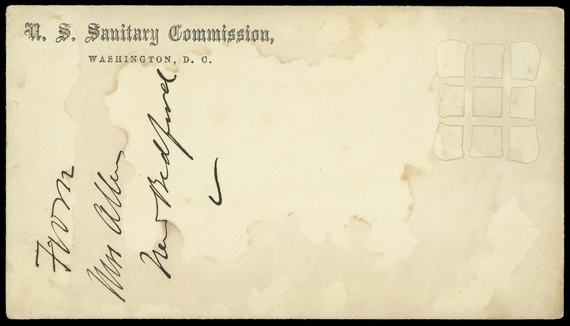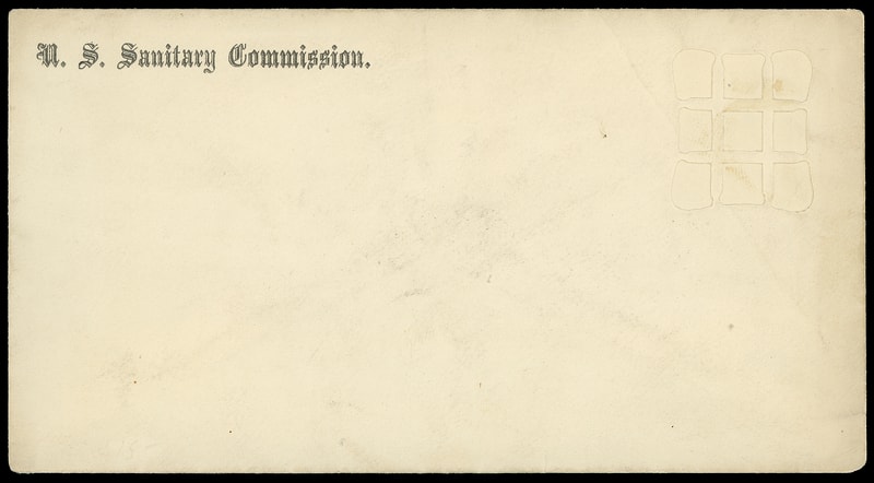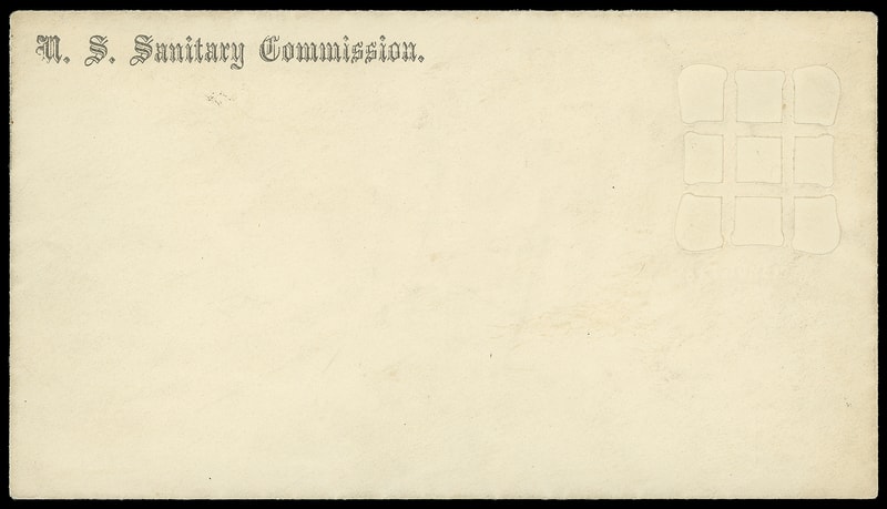 Leeds & Franklin Patent Envelope, three unusued entires with Type IA with "#" bars lattice pattern comprising two different "U.S. Sanitary Commission" imprint size envelopes (3 x 5 7/16", 3 3/8 x 6¼") and last with "U.S. Sanitary Commission, Washington D.C." imprint on 3 x 5 7/16" envelope endorse "From Mrs Allen, New Bedford" with some staining, F.-V.F. group.