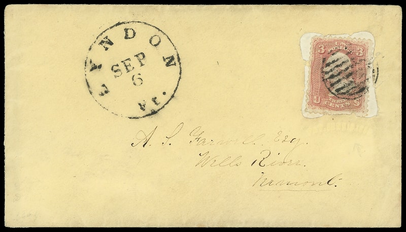 Leeds & Franklin Patent Envelope, two buff envelopes with Type IA with "#" bars lattice pattern and blind embossed "Pat. June" beneath, both from same sender showing 3¢ rose (65) affixed incorrectly underneath the lattice and correctly above the lattice, each 3¢ tied by encircled grid cancel, matching "Lyndon Vt. Jul 30" and "Sep. 6" cds strikes respectively to Cabot Vt. and Wells River Vt., first with only portion of letter and 3¢ torn, second with complete letter, Very Fine pair that would make an ideal exhibit page; each with P.F. certificate (2009, 2015).
