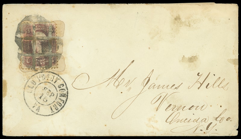 Leeds & Franklin Patent Envelope, envelope assembled in reverse with Type IA with "#" bars lattice pattern and blind embossed "Pat. June" beneath, bearing 3¢ rose (65) affixed to piece and inserted into Leeds Patent envelope, canceled by cork, matching "Old Point Comfort Va. Sep 16" double-circle datestamp to Vernon N.Y., Leeds patent window completely intact, some toning, otherwise Very Fine, ex-Weiland, "Lake Shore" .