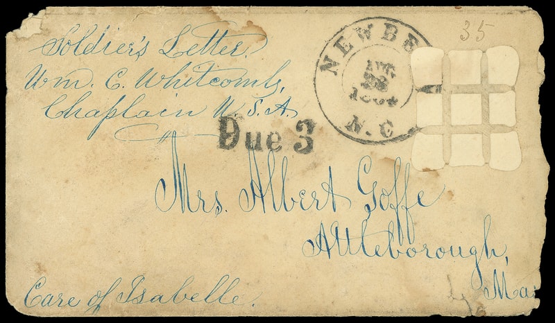 Leeds & Franklin Patent Envelope, envelope with Type IA with "#" bars lattice pattern, endorsed "Soldier's Letter, Wm. C. Whitcomb, Chaplain U.S.A.", entered mails with "Newberg N.c. Aug 28, 1864" cds and "Due 3" soldier's rating handstamp to Attleborough Mass.; toning and stains, roughly opened at right, Fine and rare, the only recorded soldier's letter Leeds use .