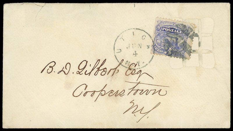Leeds & Franklin Patent Envelope, envelope with Type IA with "#" bars lattice pattern, bearing 3¢ ultramarine (114) , nat. s.e., affixed partially over lattice and tied by "Utica N.Y. Jun 4" circa 1869 duplex to Cooperstown, N.Y.; flap torn ending in small top edge tear, Very Fine and rare latter use.