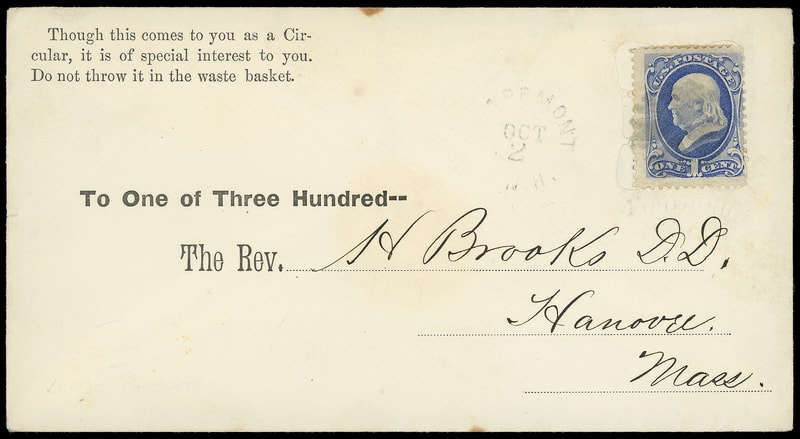 Leeds & Franklin Patent Envelope, envelope with Type IA with "#" bars lattice pattern, bearing 1¢ ultramarine (145) , affixed correctly over lattice and canceled by grid cancel, matching partial "Claremont N.H. Oct 2" rimless cds to Hanover Mass., printed "Though this comes to you as a Circular, it is of special interest to you, Do not throw it in the waste basket" at top left indicating correct 1¢ circular rate use; tiny edge stain, fresh and Very Fine, the only recorded 1870 Bank Note issue Leeds use, the latest recorded .