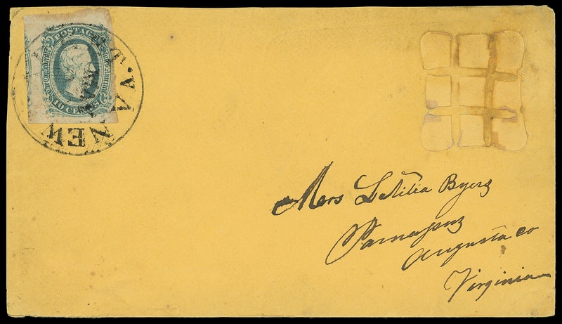 Leeds & Franklin Patent Envelope, orange envelope with Type IA with "#" bars lattice pattern and embossed "Pat June 19, 1860" below, bearing CSA 1863, 10¢ blue (11) , large to huge margins, tied by "New Market Va. May 20" cds to Augusta County, Virginia; some light gum residue on split lattice, Very Fine and rare, ex-Meyerson .