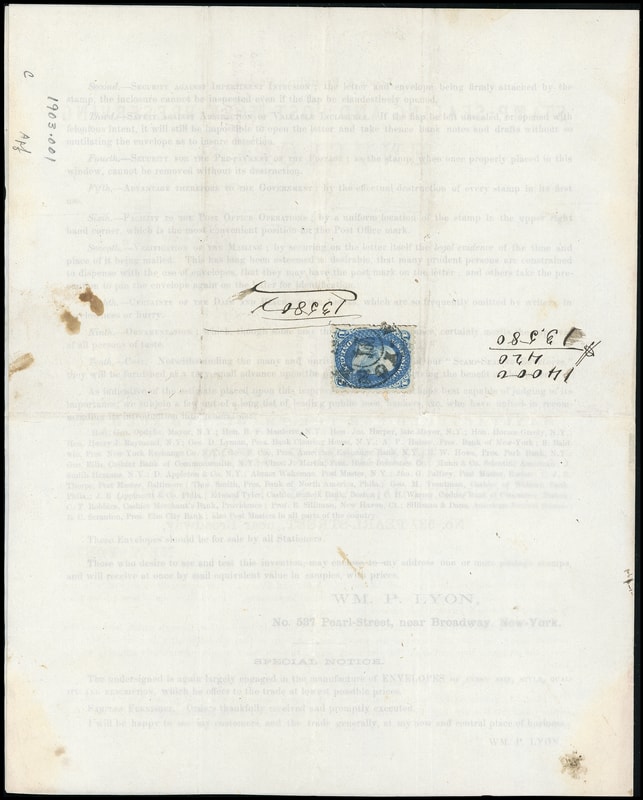 Leeds & Franklin Patent Envelope with Printed Advertising Circular, buff Type IA with "#" bars lattice pattern, bearing 1¢ blue (63) tied by "New-York, Oct 27" cds on printed two-page circular with illustration of a Leeds stamped envelope and titled "Leeds & Franklin's Patent Stamp-Sealing and Post-Mark-Preserving Envelopes", bottom half with "William P. Lyon, Envelope Manufacturer", text extols the virtues of the Leeds patent including "Fourth - SECURITY FOR THE PRE-PAYMENT OF POSTAGE; as the stamp when once properly placed in this window, cannot be removed without its destruction" and "Fifth - ADVANTAGE THEREFORE TO THE GOVERNMENT; by the effectual destruction of every stamp in its first use", addressed to Nebraska City Neb.; envelope reduced slightly at top with couple envelope tears from letter removal, Very Fine and a wonderful item for the study of early stamp reuse prevention.