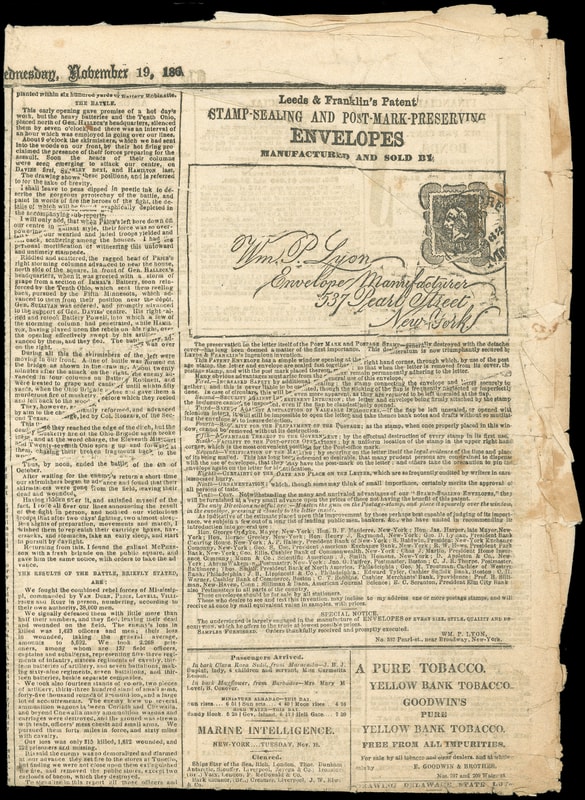Leeds & Franklin's Patent Stamp-Sealing and Post-Mark-Preserving Envelopes, illustrated advertisement depicting the 1861 3¢ value on newspaper page of the Wednesday, November 19, 1862 edition of the The New York Times by Wm. P. Lyon, with different illustration and similar text in the original Lyon's circular advertisement; some wrinkling and page edge tears, Fine.
