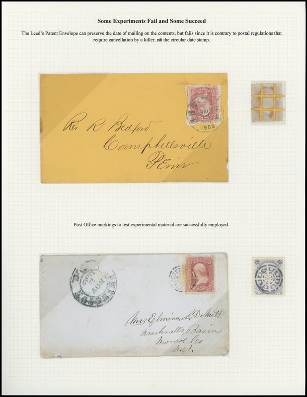 Leeds & Franklin Patent Envelope and Experimental Cancel, exhibit page titled "Some Experiments Fail and Some Succeed" with orange envelope with Type IA with "#" bars lattice pattern and embossed "Pat June 19, 1860" below, bearing, bearing 3¢ rose (65) tied by "New-York, Dec 18, 1862" cds to Campbellsville Pa.; off-cover 3¢ rose (65) on piece showing orange Type Ia lattice, and last is cover bearing 3¢ rose (65) tied by experimental circular geometric cancel, matching "Washington D.C. Nov 2, 186" double-circle to Bushnell's Basin N.Y.; some faults, F.-V.F.; Leeds Envelope with 2005 P.F. certificate.
