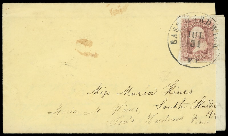 Leeds & Franklin Patent Envelope Balance, group of 12 items including Type Ia lattice envelope bearing 3¢ rose (65) tied by "East Hardwick Vt. Jul 31" cds, reduced at right, second is front bearing 3¢ rose (65) tied by "Washington D.c. Sep 2" duplex, third is 1¢ blue (63) use adjacent to missing lattice where additional 2¢ would have been placed, three amber or buff envelopes missing franking, five letters or part letters bearing 3¢ #65 frankings with lattice beneath, and last is a bogus fake 3¢ bank note use; some faults, F.-V.F. and interesting group.