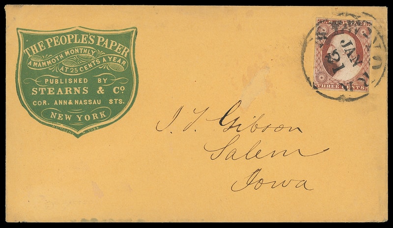 (Cameo) The Peoples Paper, Stearns & Co., New York, embossed green shield cameo corner card with "W. Murphy, New York" imprint on buff cover bearing 3¢ dull red (11A) , four margins, tied by "New-York, Jan 21" cds to Salem, Iowa; abrasion spot, Very Fine, ex-Biddle .
