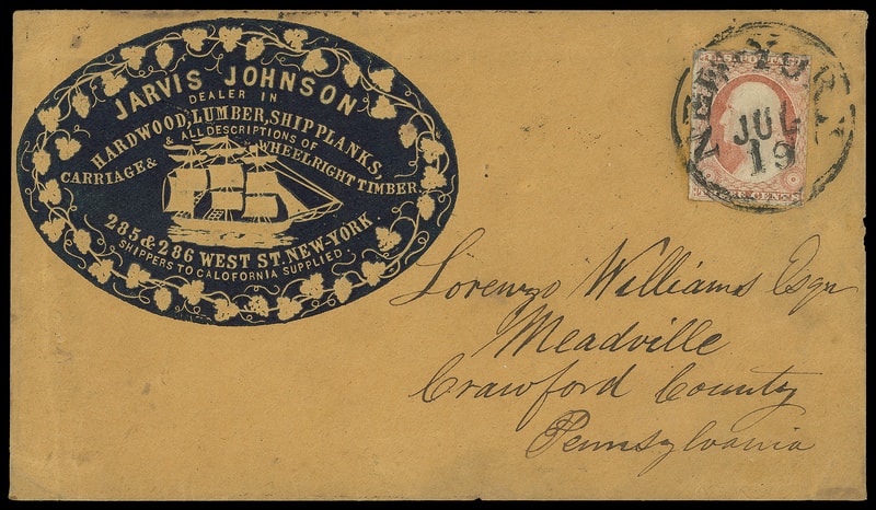 (Cameo) Jarvis Johnson, Dealer in Hardwood, Lumber, Shipping Planks etc, New York N.Y., blue embossed cameo corner card with illustration of three-masted ship, elaborate design with grapevines surrounding the ship and wording, on orange buff cover bearing 3¢ dull red (11A) , full margins except touched at right, tied by "New-York, Jul 19" cds to Meadville Pa., an outstanding design, with 2006 P.F. certificate, Very Fine and outstanding cameo design.