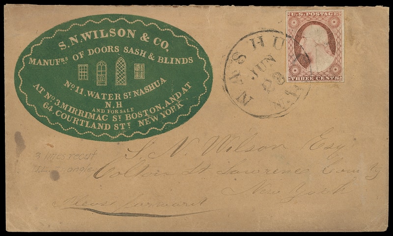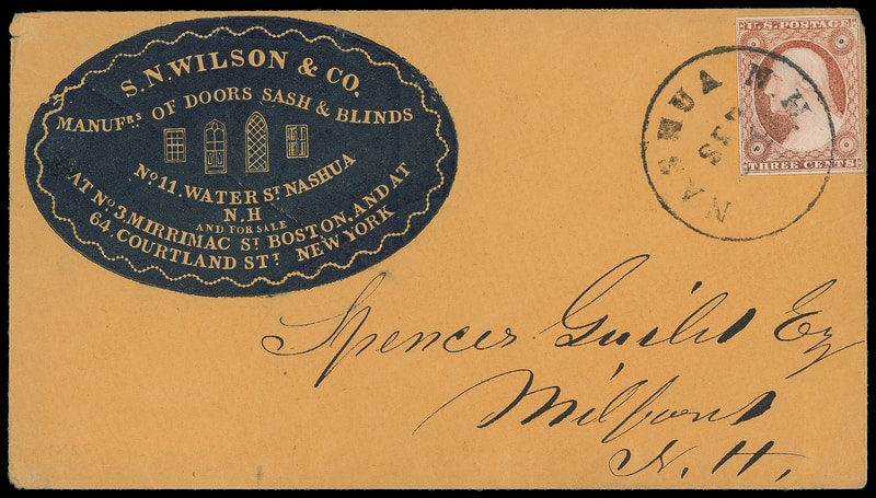 S. N. Wilson & Co., Doors, Sash & Blinds Manufacturer, Nashua N.H., blue and green cameo-style advertising illustrated with window frames and shudders, blue corner card on orange cover bearing 3¢ dull red (11A) tied by "Nashua N.H., Sep 24" cds to Milford N.H.; green corner card on buff cover bearing 3¢ dull red (11A) tied by "Nashua N.H. Jun 23" cds to New York City, small tear, otherwise Very Fine matching pair of blue and green corner cards.