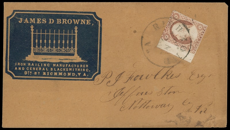 James D. Browne, Iron Railing and General Blacksmithing, Richmond Va., blue illustrated cameo showing railing on buff cover bearing 3¢ dull red (11A) left sheet margin single , scissor cut in margin, tied by "Richmond Va. Jun 24" cds to Jeffries Store Va.; faint spots at bottom right, Very Fine Virginia cameo.