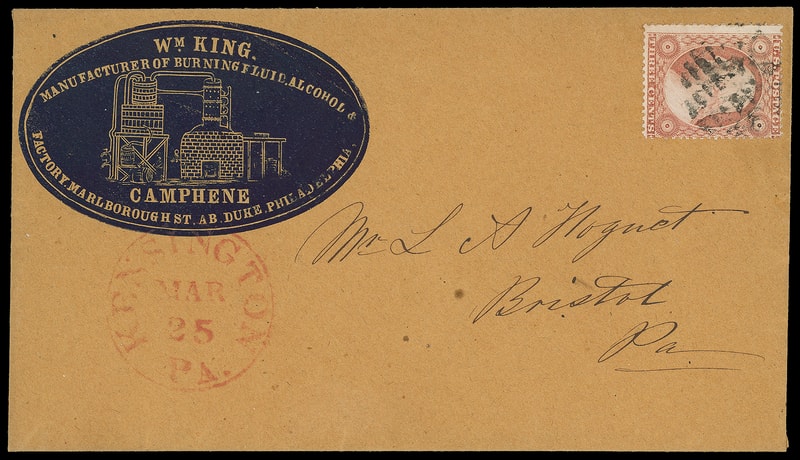 William King, Burning Fluid, Alcohol & Camphene, Kensington Pa., blue embossed illustrated cameo corner card showing distilling equipment on orange cover bearing 3¢ dull red (26) canceled by grid, red "Kensington Pa. Mar 25" cds to Bristol Pa., Extremely Fine and choice.
