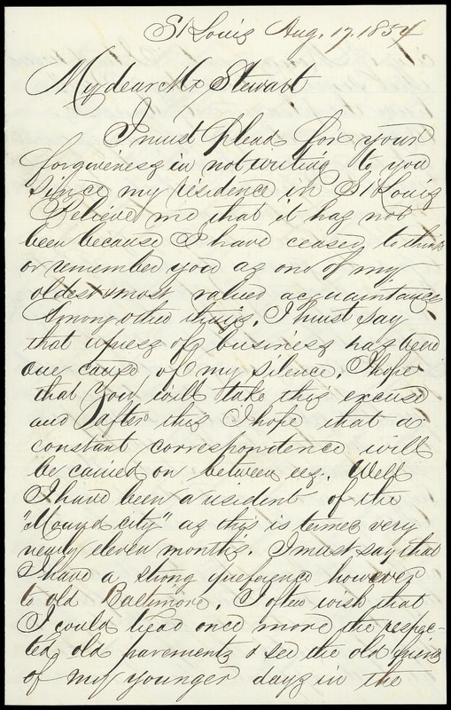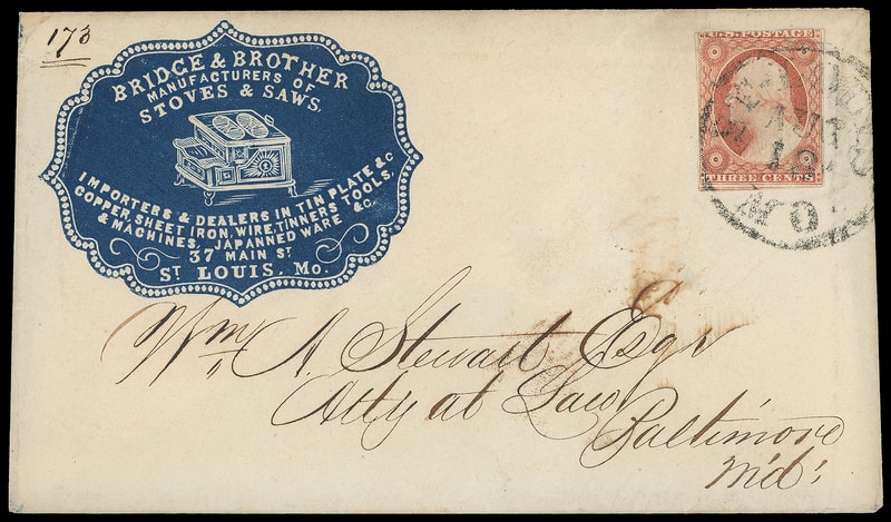 Bridge & Brother, Stoves and Saws, St. Louis Mo., blue embossed shield cameo corner card with stove illustration on cover bearing 3¢ dull red (11A) margins to in, tied by "St. Louis Mo. Aug 18" cds to Baltimore Md., with original 1854 letter, Very Fine and scarce St. Louis cameo.