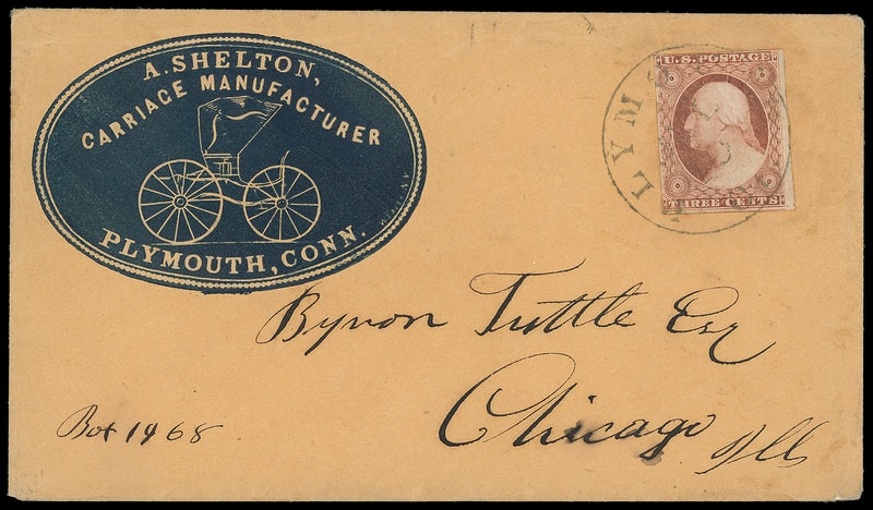A. Shelton, Carriage Manufacturer, Plymouth Conn., blue embossed oval cameo illustrated with carriage on orange buff cover bearing 3¢ dull red (11A) , large margins to touched, minor score mark, tied by "Plymouth Ct. Jul 10" cds to Chicago Ill., a Very Fine and beautiful cameo.