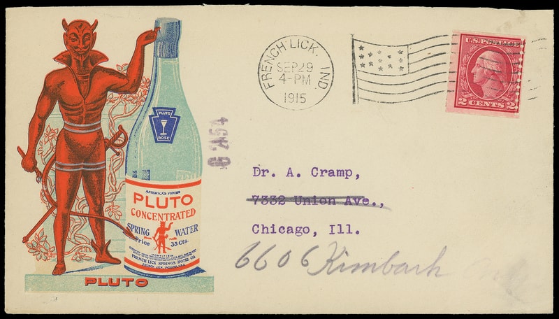 Pluto Concentrated Spring Water, multicolor illustrated design showing Devil and Pluto Bottle, on cover bearing 2¢ carmine (453) coil tied by "French Lick, Ind. Sep 29, 1915" machine cancel to Chicago Ill., forwarded locally, arrival backstamp, Extremely Fine.