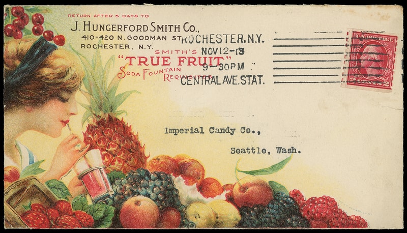 "True Fruit" Soda Fountain Requisites, Rochester N.Y., multicolored illustrated agent ad design showing Women Drinking Soda and Various Fruit on Southern Drug Co. corner card cover bearing 2¢ red tied by "Rochester N.Y. Nov 12 -13" machine cancle to Seattle Wash.; tiny edge tear at right, Very Fine and wonderful ad design.
