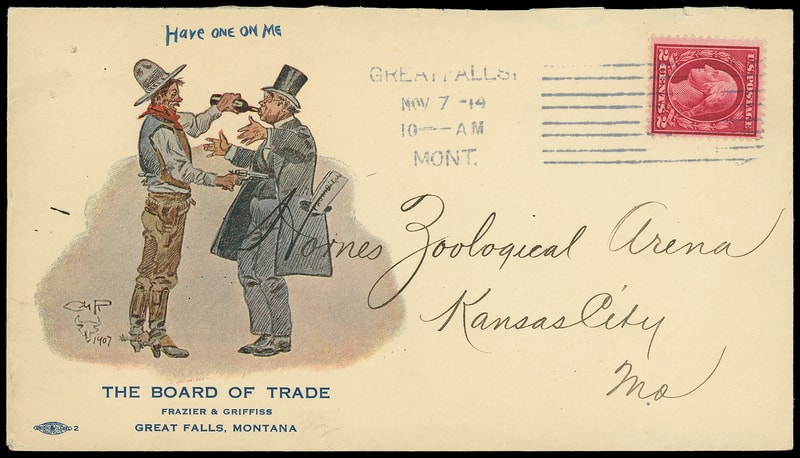 (Artist) Charles M. Russell "Have one on Me", multicolor illustrated advertising produced for The Board of Trade, Frazier & Griffiss on amber cover bearing 2¢ red tied by "Great Falls, Mont. Nov 7, 1914" machine cancel to Kansas City Mo., Very Fine.