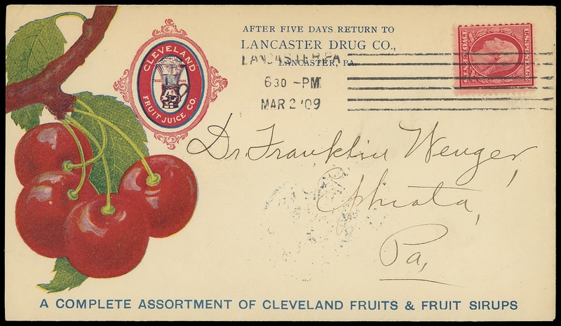 Cleveland Fruit Juice Co, multicolor ad cover with logo and cherries, "Buckeye Rootbeer" ad on reverse, on 1909 cover bearing 2¢ carmine tied by "Lancaster, Pa. Mar 2 '09" machine cancel to Ephrata Pa., Very Fine and beautiful ad.