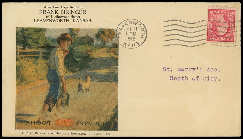 (Gun & Powder) DuPont Powder, multicolor ad cover with illustration of a boy holding a gun and the days kill on cover bearing 2¢ carmine tied by "Leavenworth, Kans. Oct 11, 1919" machine cancel to local city address, Very Fine and rare gun design.
