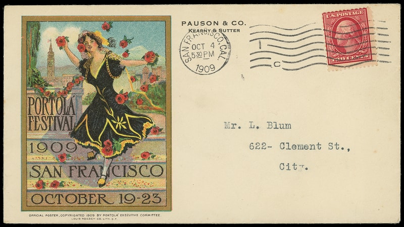 (Fairs) 1909 Portola Festival, San Francisco, multicolor porster illustration, additional imprint of Pauson & Company men's wear store on cover bearing 2¢ carmine tied by "San Francisco Cal. Oct 4, 1909" machine cancel to local city street address, Extremely Fine and stunning design.