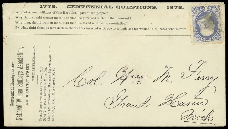 (1876 Philadelphia) Centennial Headquarters, National Woman Suffrage Association, Philadelphia Pa., advertising on unsealed cover bearing 1¢ ultramarine (156) tied by cork cancel addressed to Col. Wm. M. Ferry, Grand Haven, Mich., ad lists President Elizabeth Stanton and Cor. Secretary Susan B. Anthony; small upper left cover tear, otherwise Very Fine and scarce Woman Suffrage advertising.